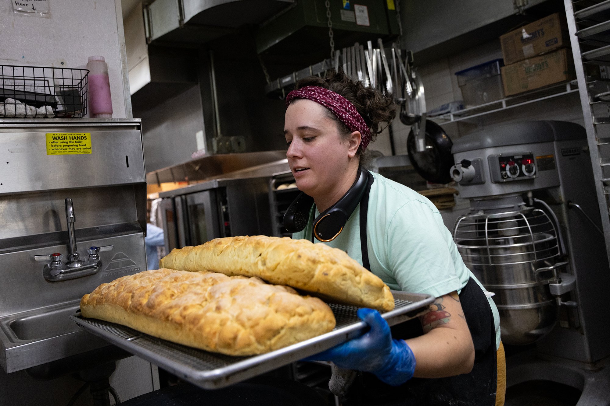 Jes Perkins hefts loaves of the bakery’s Italian bread on a cooling tray. Fresh sandwich bread is baked every day.
