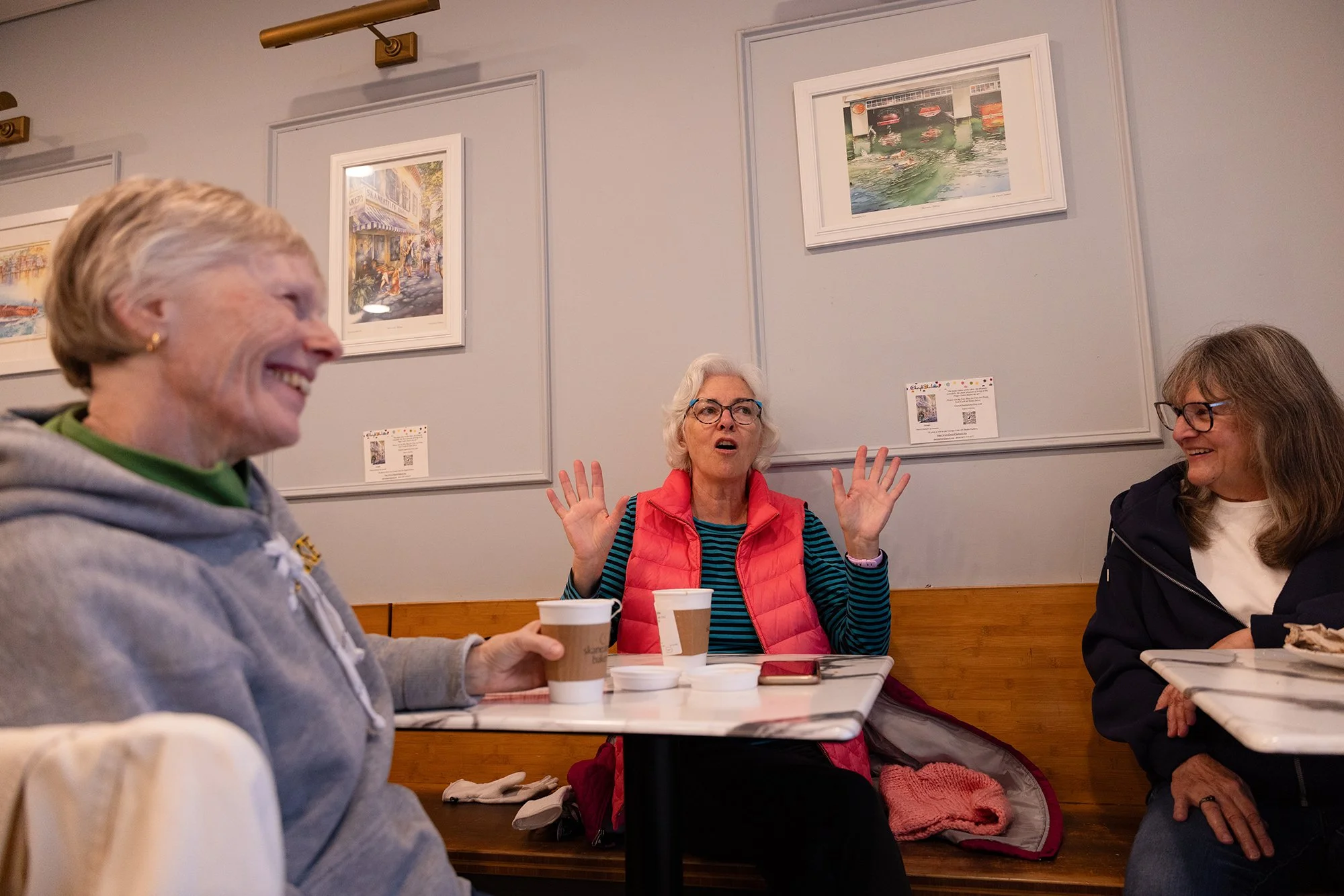 From left to right, regulars Rene McCarthy and Mary Jo Clary converse with a visiting tourist in the sitting space at the front of the bakery. McCarthy and Clary visit the bakery with three other friends for coffee and tea after their morning walk almost every day of the week. When weather permits, they sit on the benches outside the bakery.