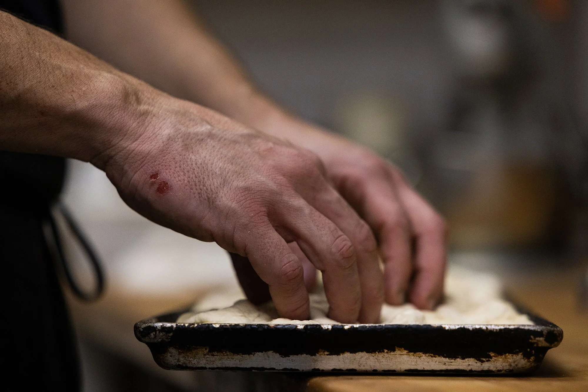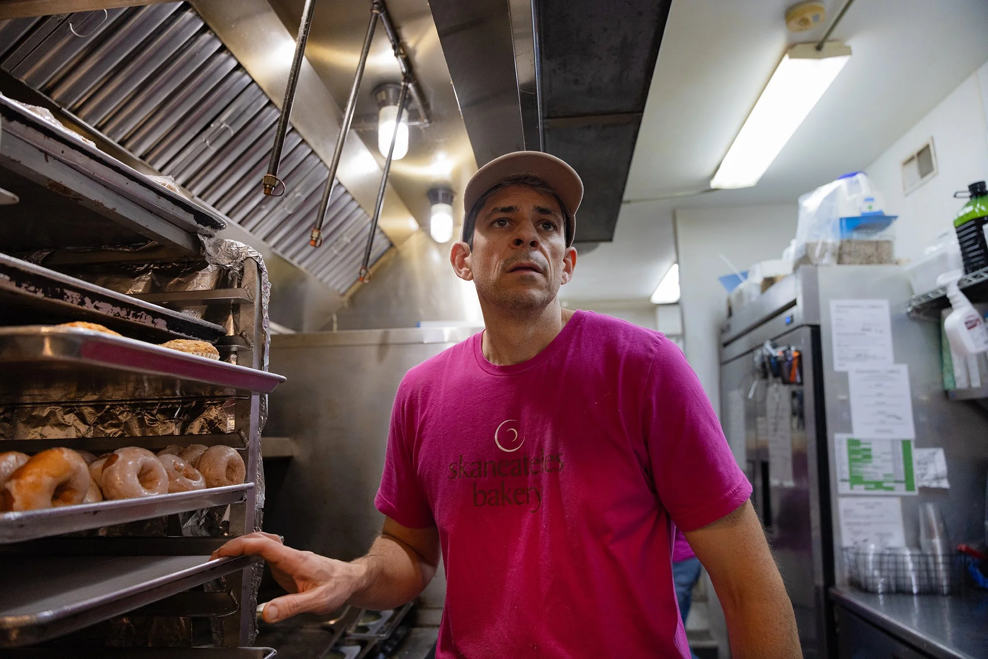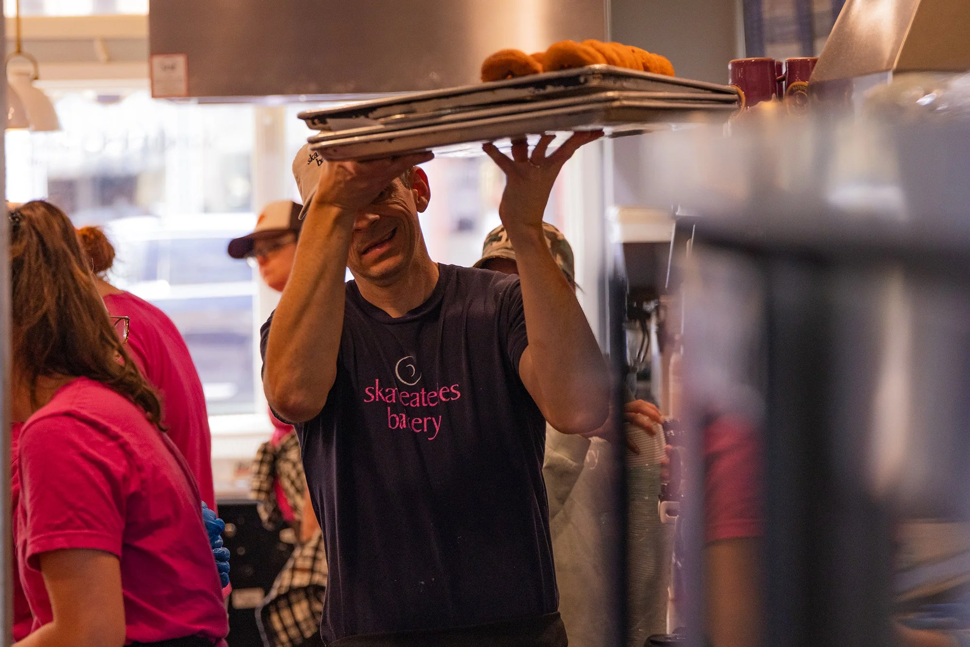 Chris Grilli balances a tray of donuts above his head as he navigates the narrow pathway of the kitchen. The kitchen and coffee bar are often crowded with staff and bakers balancing hot trays of freshly baked bread, pastries, drinks and more.