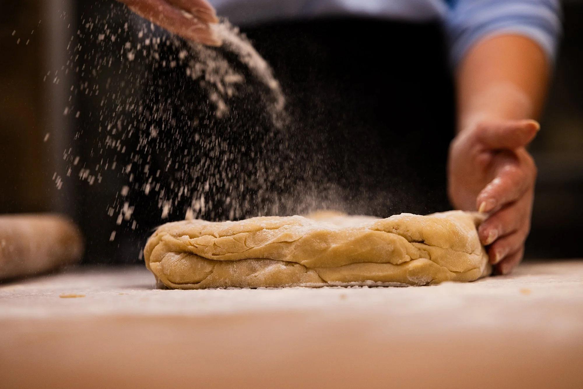 Tyema Stephens dusts flour on butter cookie dough to prevent her rolling pin from sticking. The dough will be used for Skaneateles Bakery’s signature Smiley-face cookies.