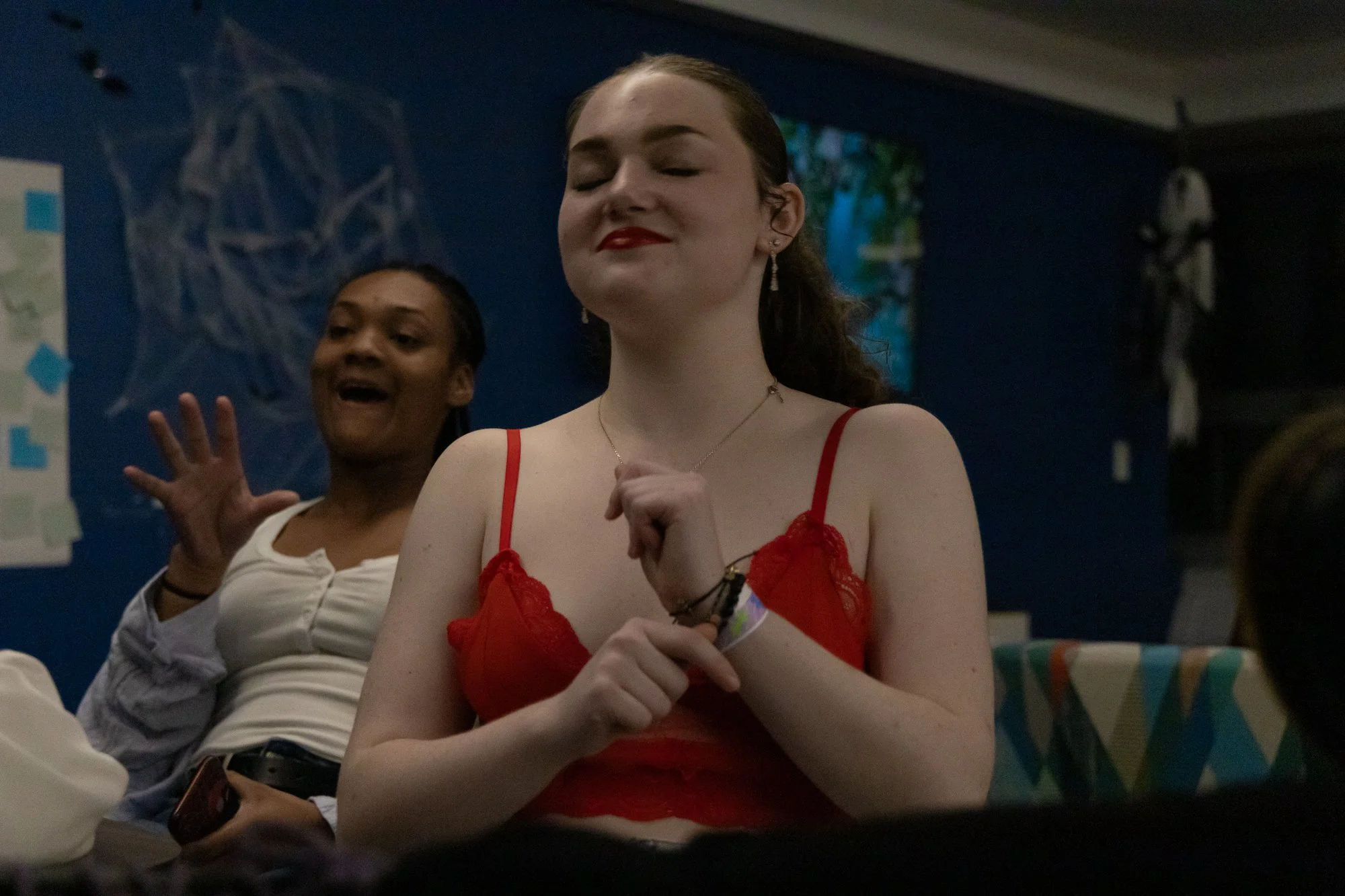 Cate Sindler (center) dances to “IT GIRL” by Aliyah’s Interlude as Ryan Thierry speaks to an LLC resident during a small gathering in the 4th floor lounge. The group were waiting on a few others before heading out to celebrate LLC dorm mate Bella’s birthday.